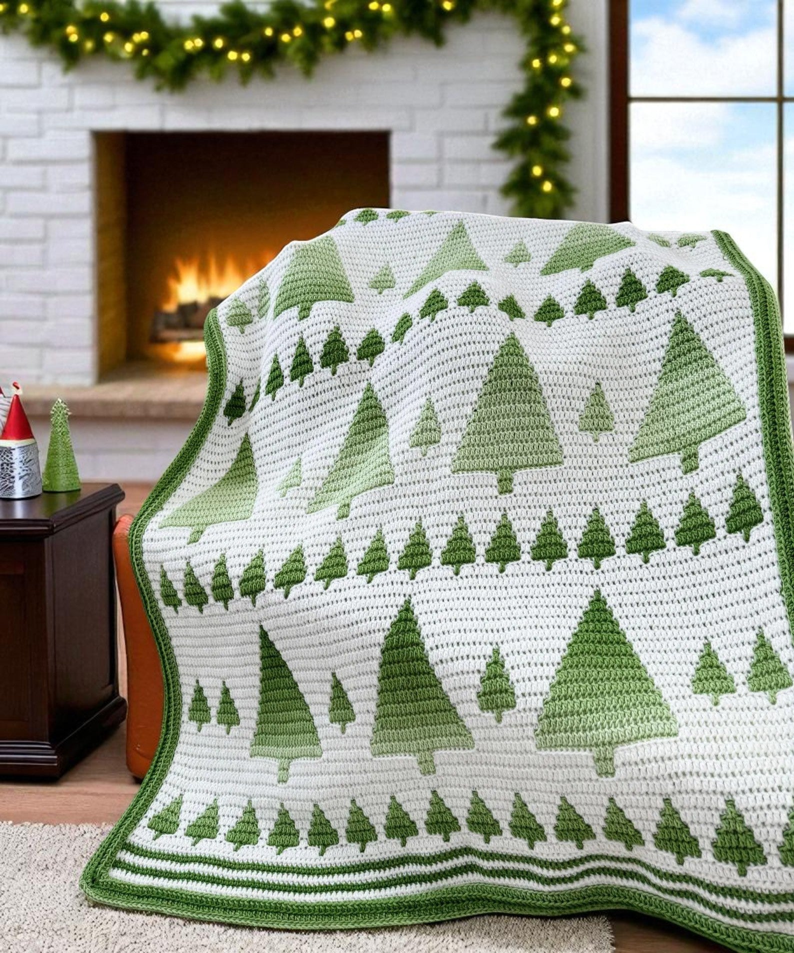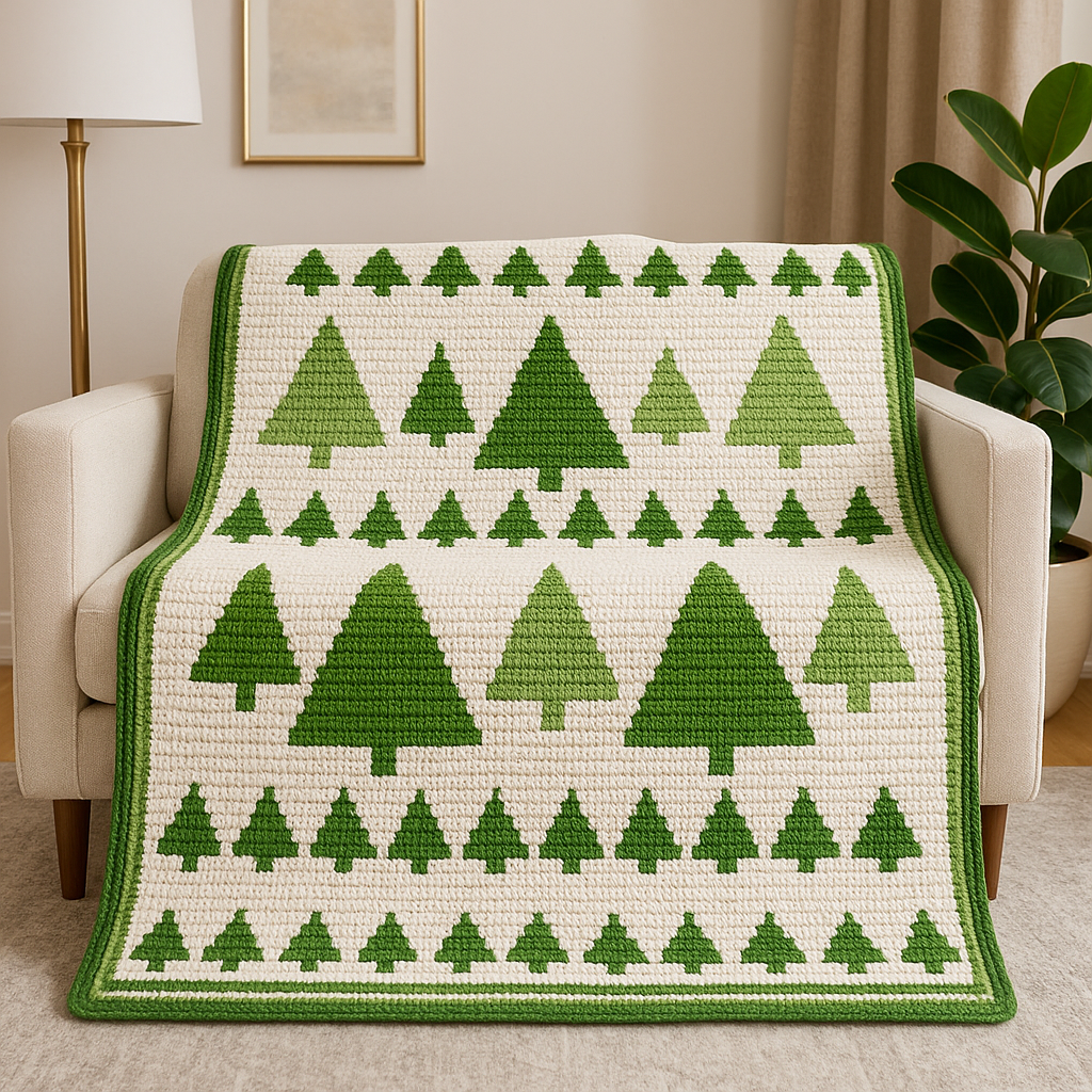Crafted using the overlay mosaic crochet technique, this design features rows of evergreen trees and a textured finish — ideal for modern or classic spaces.